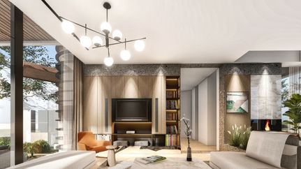 Large transparent openings dissolve the boundary between interior and exterior, allowing the living spaces to extend seamlessly into terraces, water features, and landscaped areas. The integration of outdoor elements—such as the pool, planting, and fire pit—establishes a continuous living environment that unfolds across multiple levels.